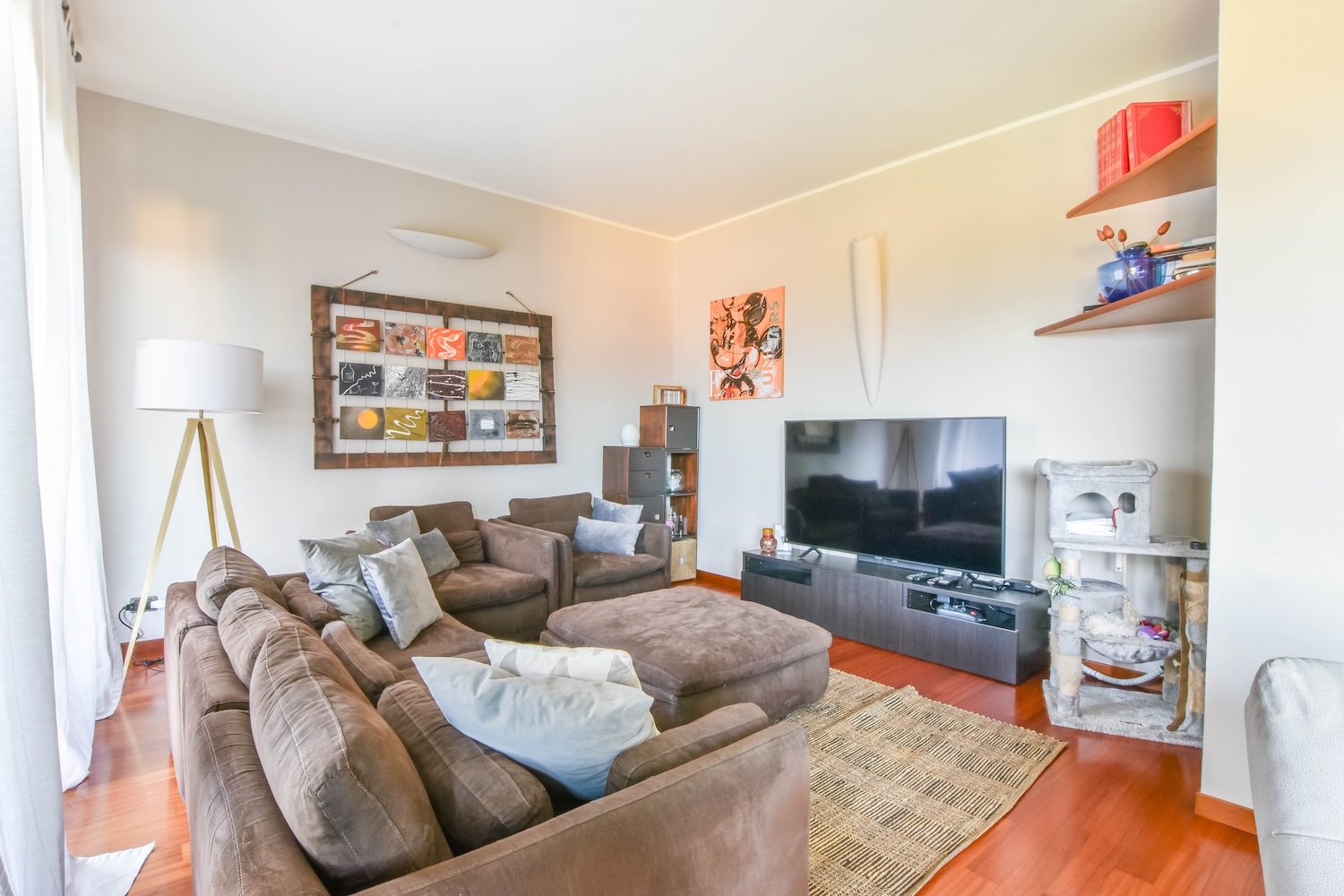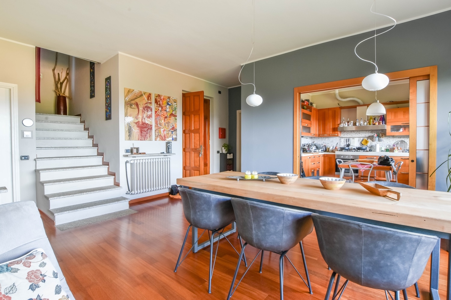 Die Küche ist bewohnbar und durch elegante Schiebetüren vom Wohnzimmer getrennt. Ein Service-Bad vervollständigt die Etage.