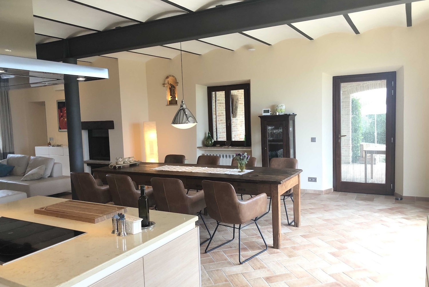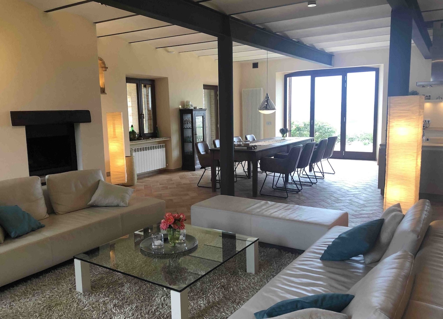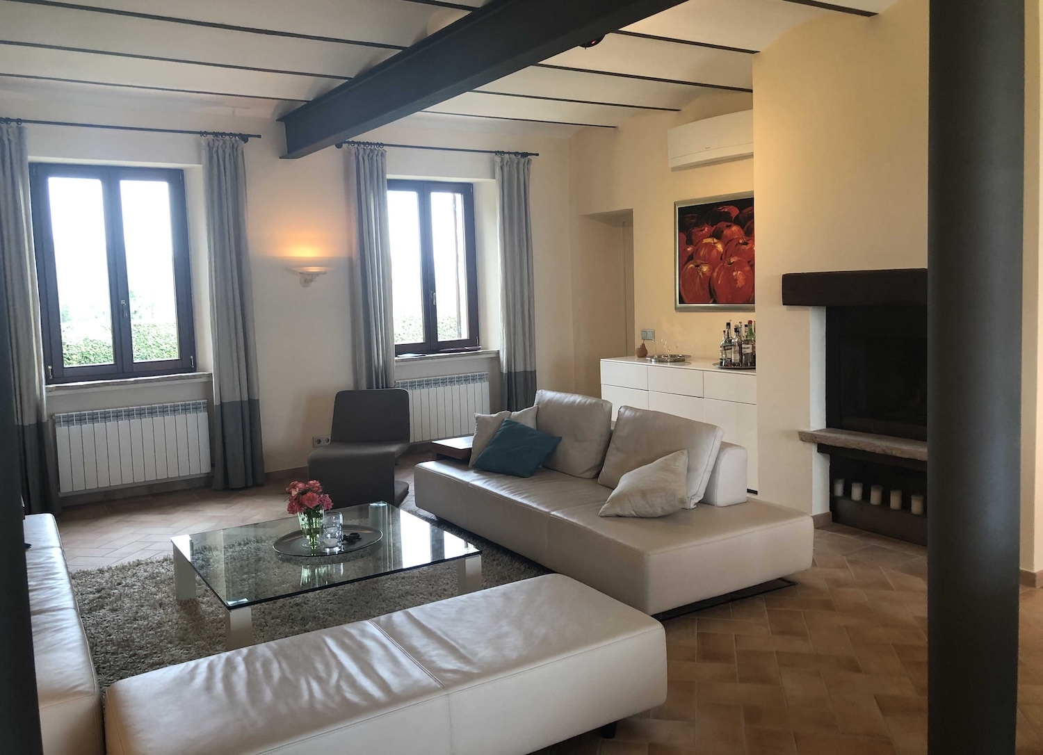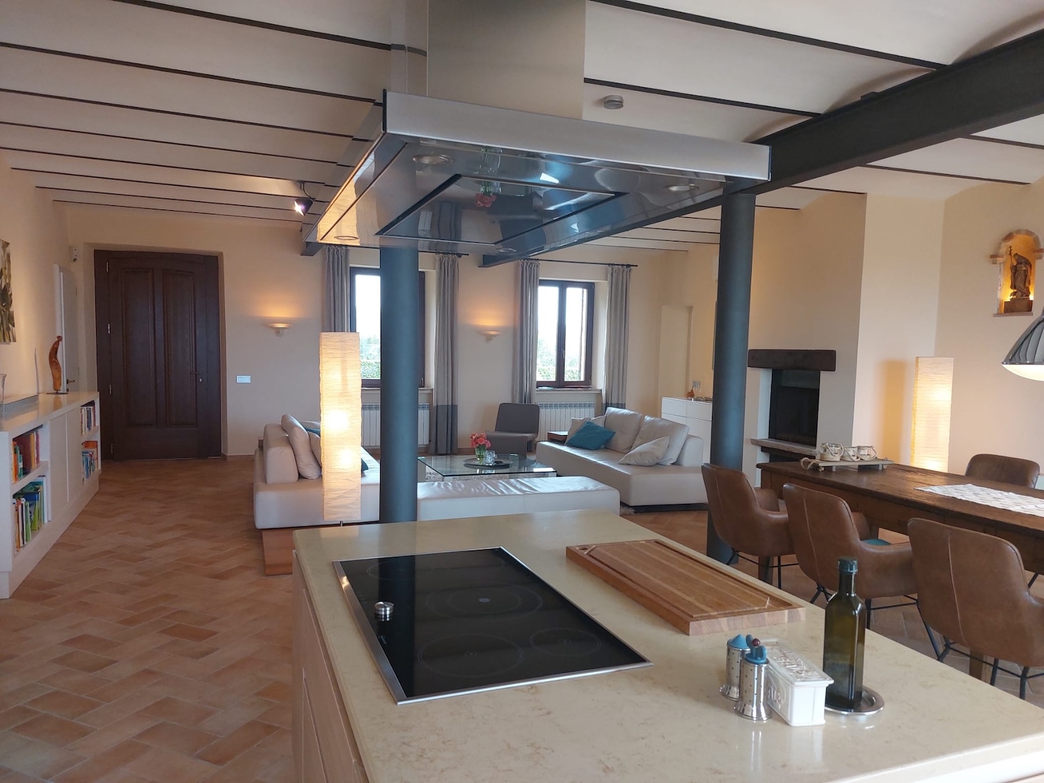 Die Wohnung im ersten Obergeschoss hat eine Fläche von ca. 200 m² (inkl. Terrasse) und besteht ebenfalls aus einem geräumigen, offenen Wohnzimmer mit voll ausgestatteter Küche, Essbereich, Kamin und Zugang zur Dachterrasse, zwei Schlafzimmern, Flur und Badezimmer.