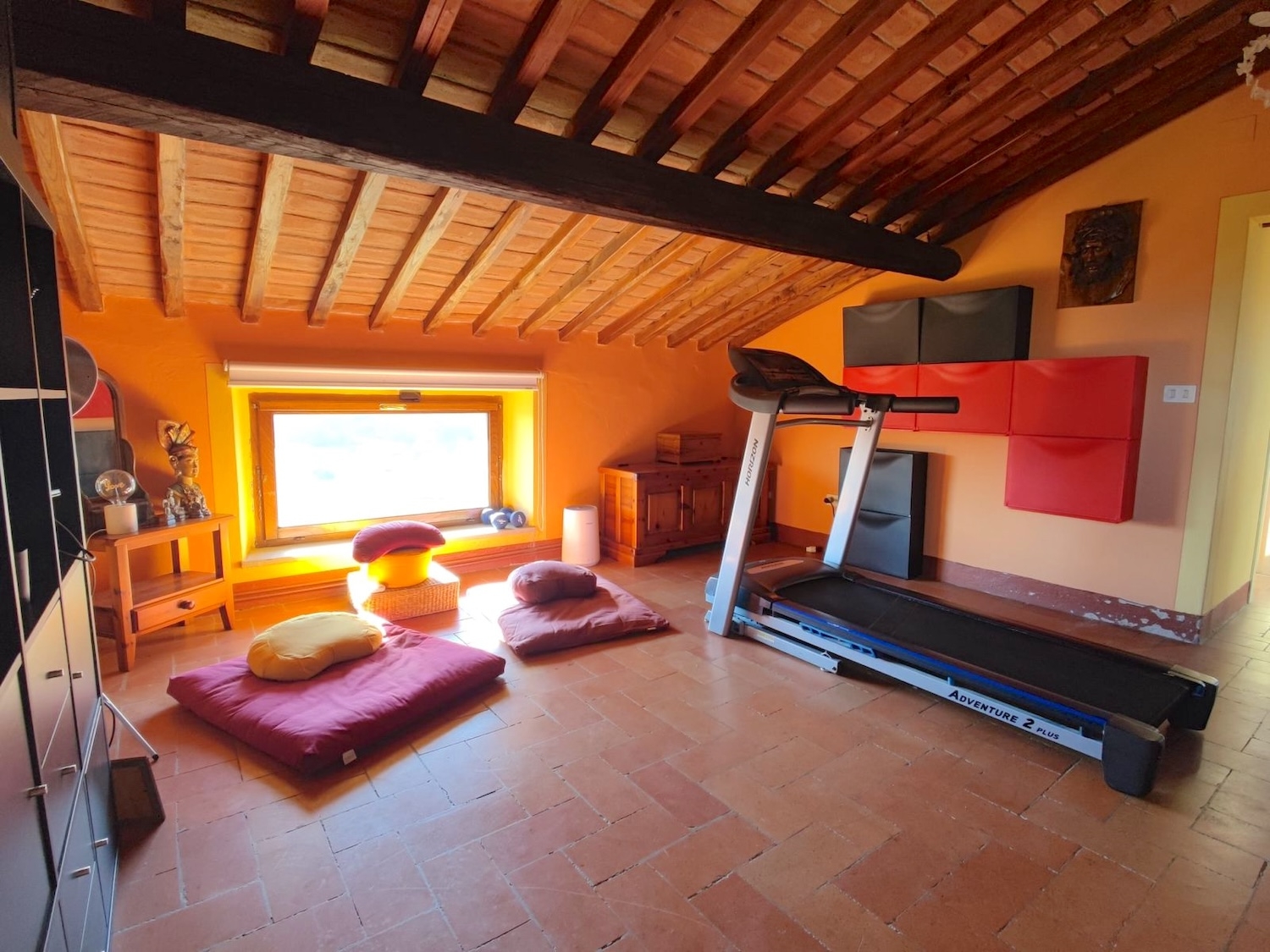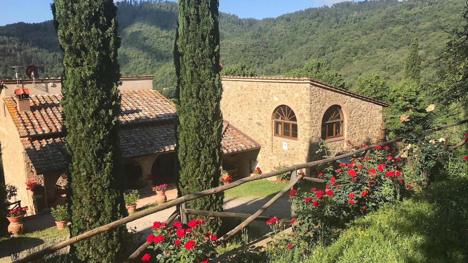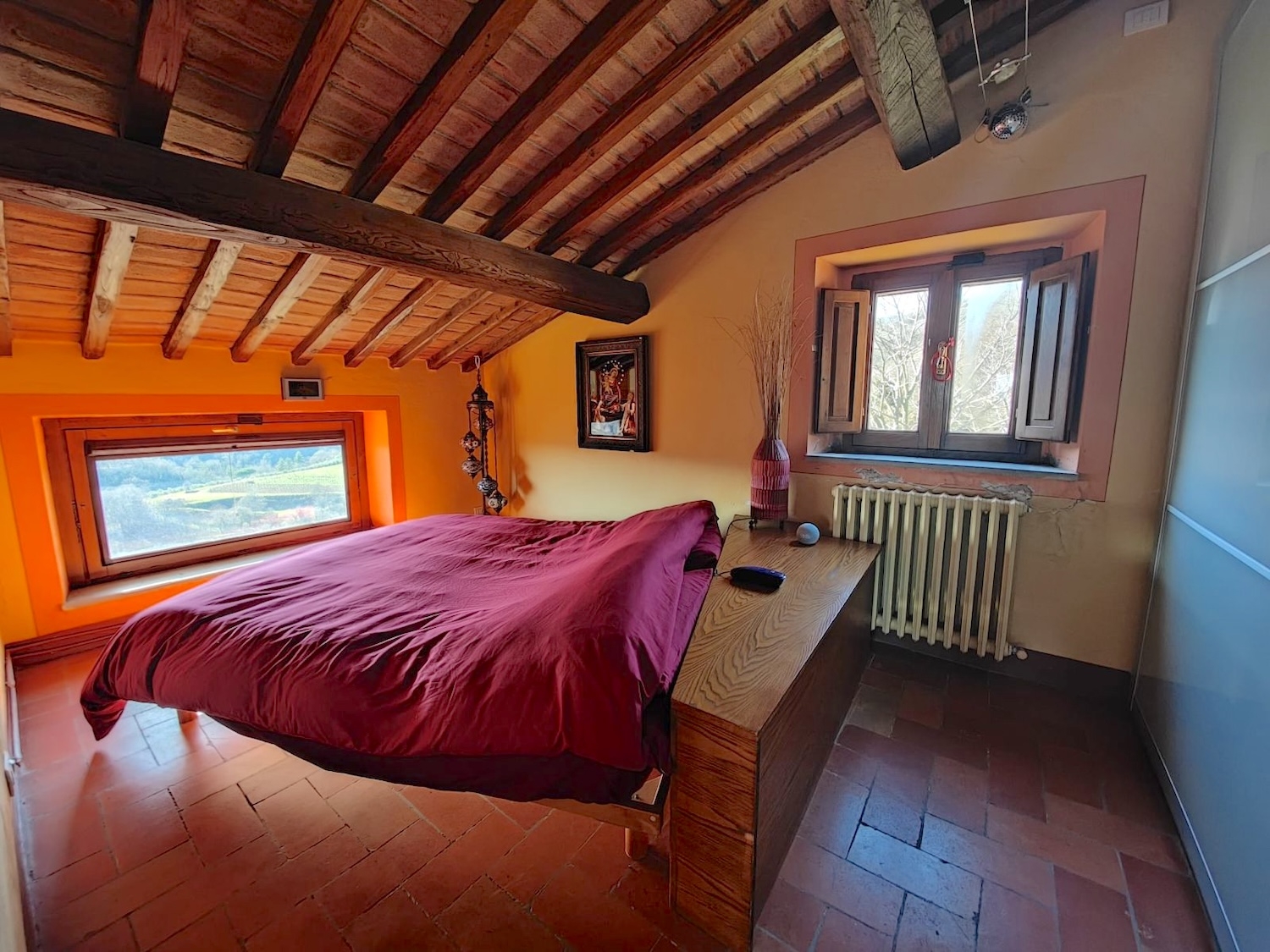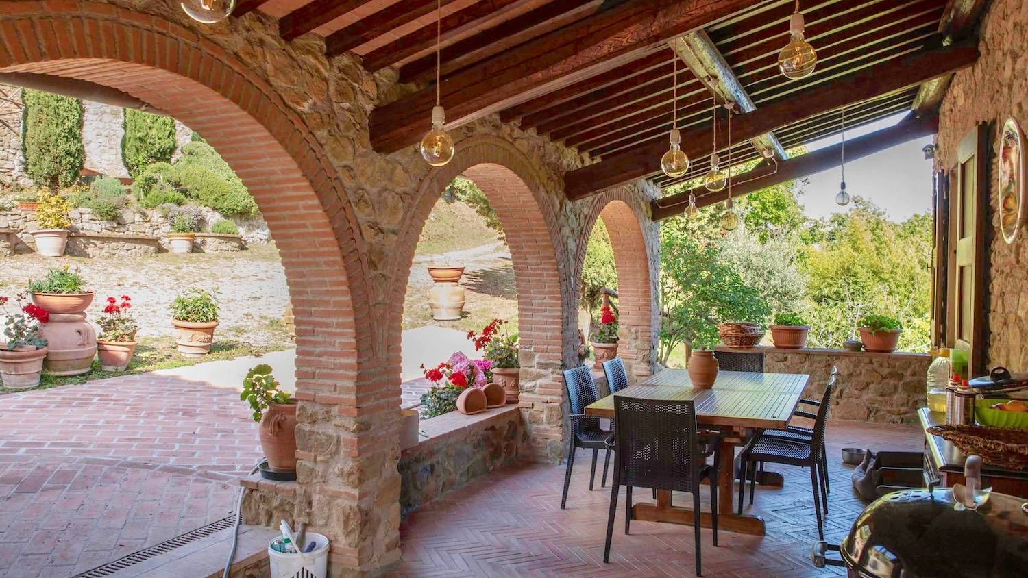 Das Landhaus befindet sich in gutem Zustand und bewahrt den typischen Charme toskanischer Häuser mit freiliegenden Steinwänden, Terrakottaböden und sichtbaren Holzbalken. Traditionelle Fensterrahmen unterstreichen die rustikale Atmosphäre, während die unabhängige Heizungsanlage modernen Komfort gewährleistet, ohne die Authentizität der Innenräume zu beeinträchtigen.