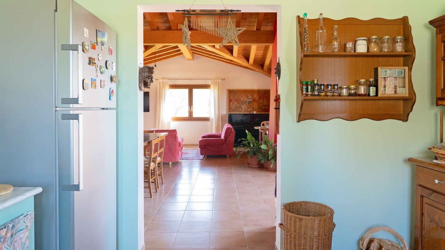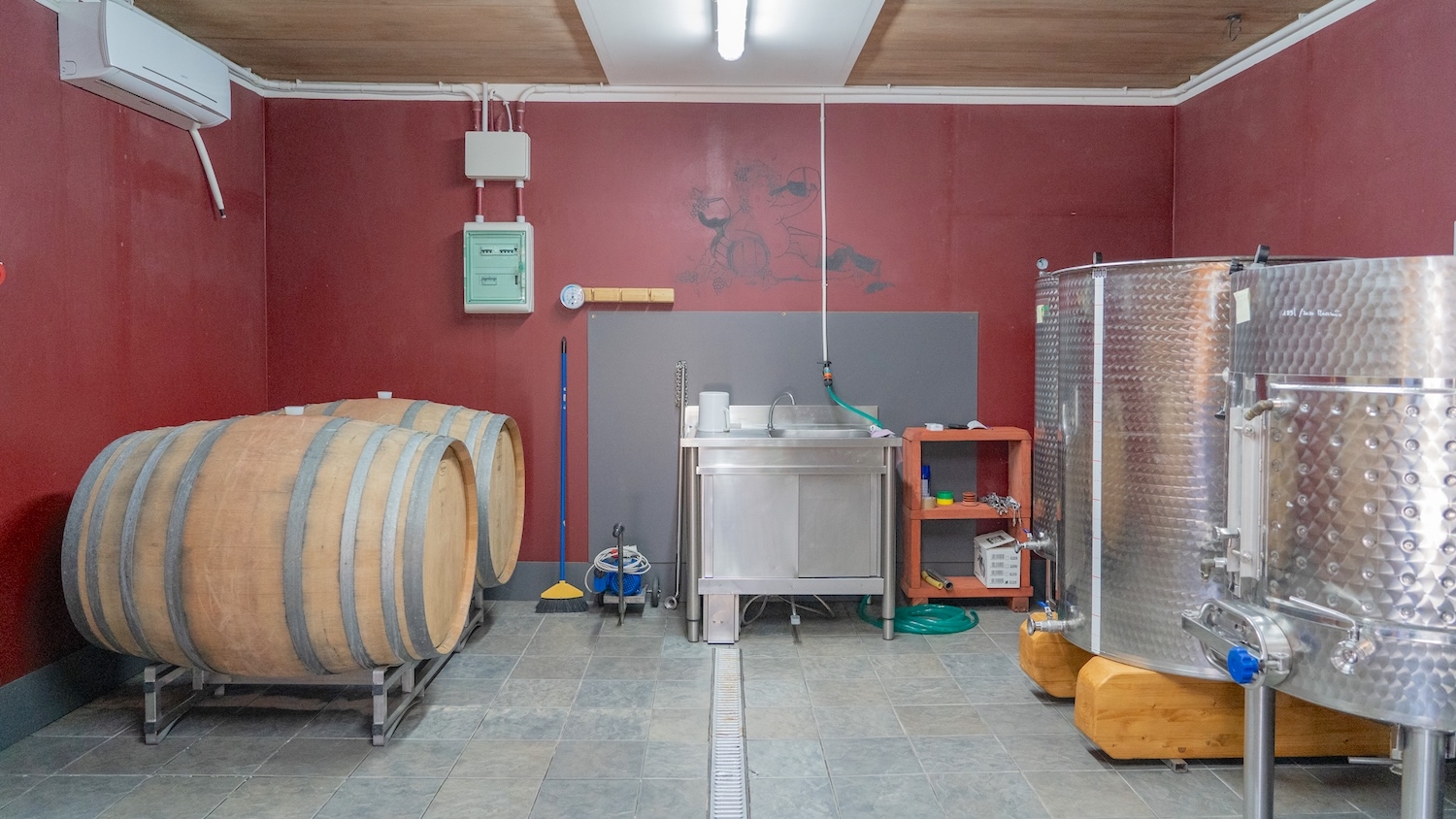 Das erste Nebengebäude erstreckt sich über zwei Ebenen: Im Erdgeschoss befinden sich das Wein- und Öllager sowie ein angrenzender Geräteschuppen, während im Untergeschoss der Weinkeller liegt.