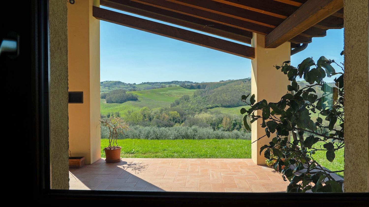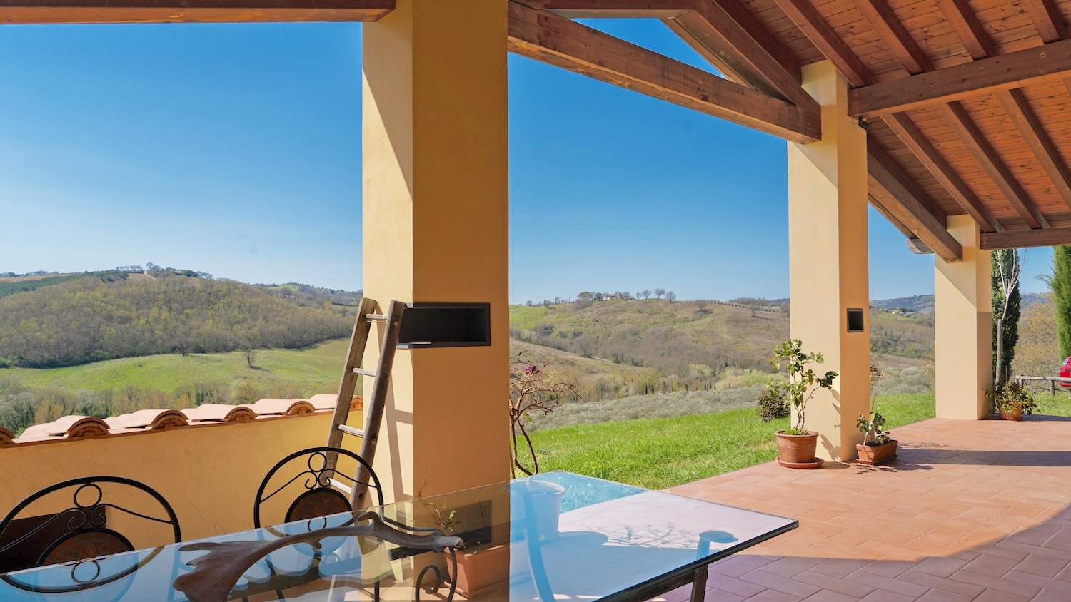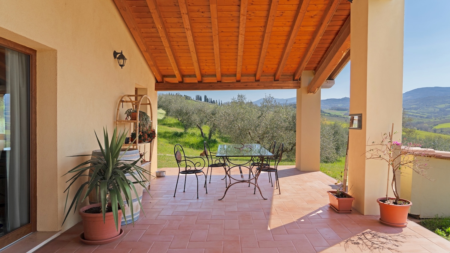 Eine Außentreppe führt zu einer kleinen Terrasse mit herrlichem Blick auf die umliegende Landschaft. In der Nähe befinden sich die landwirtschaftlichen Nebengebäude.