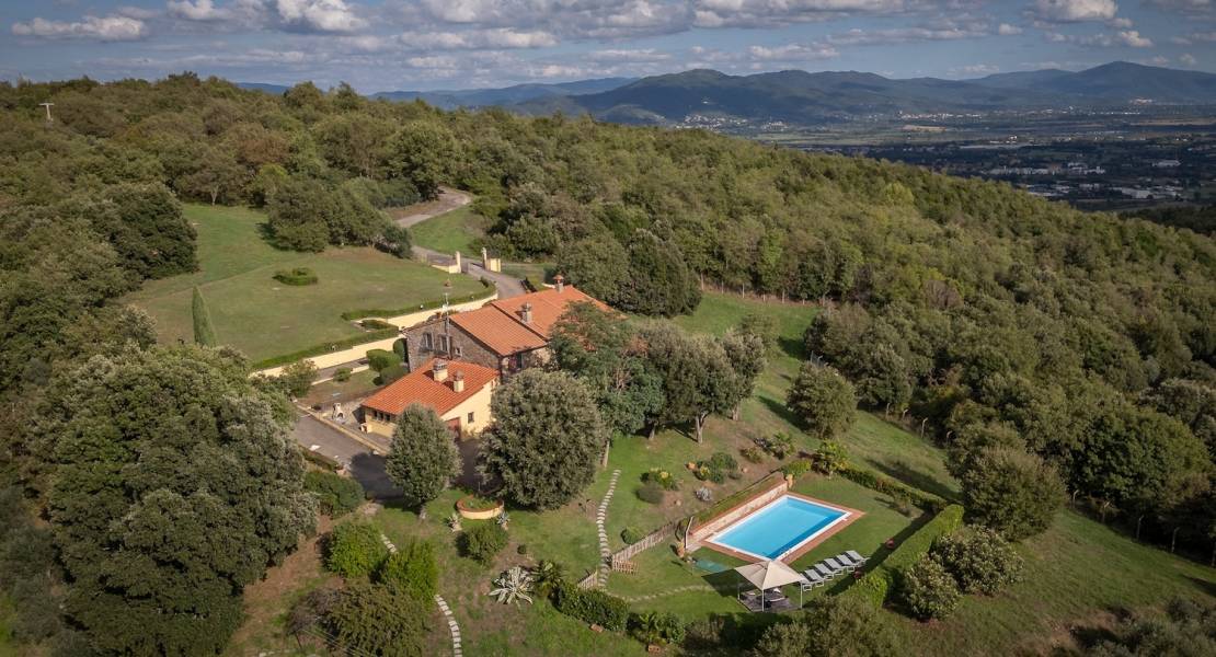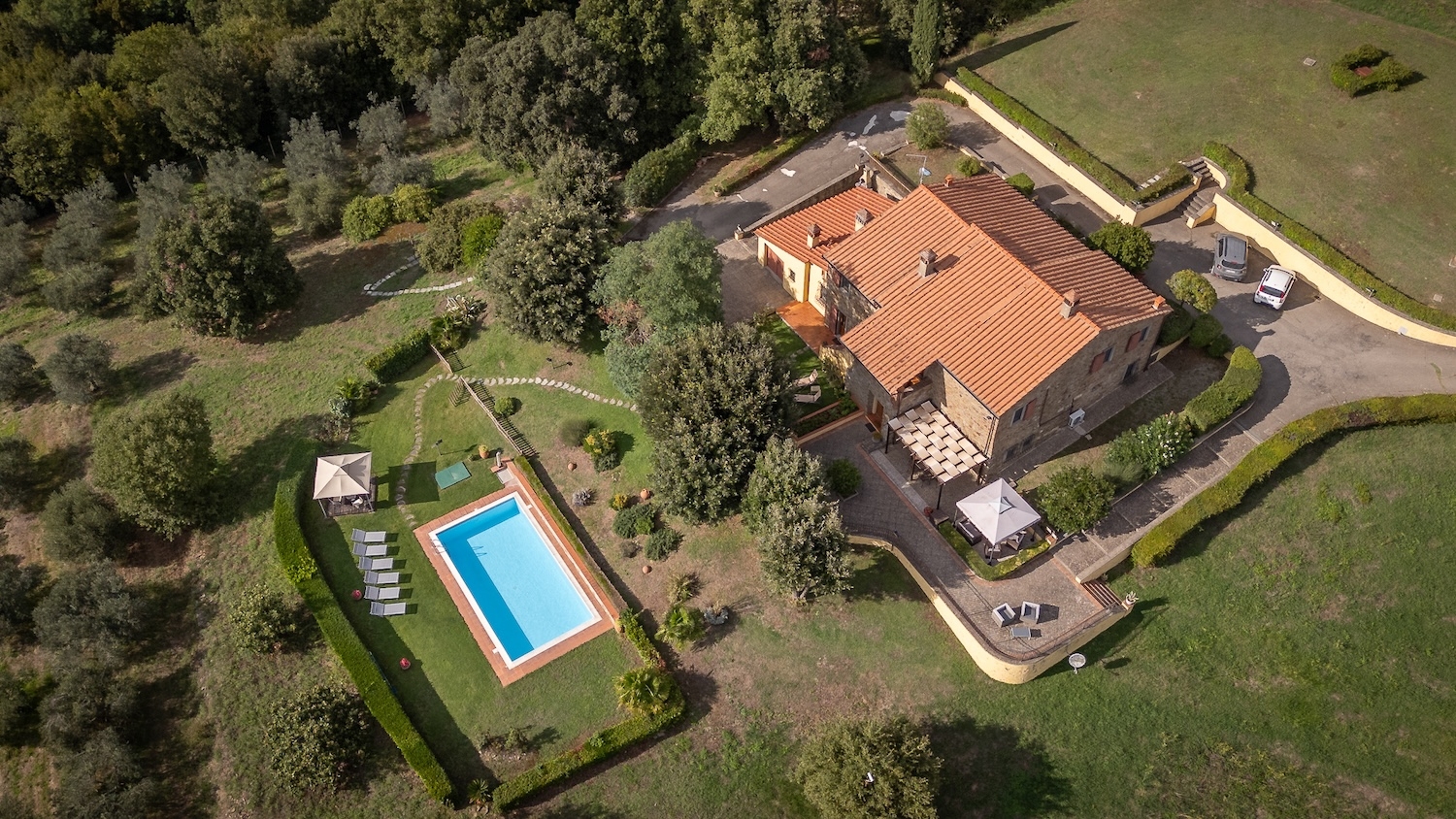 Outside, the manicured garden is enhanced by a 10x5-metre swimming pool, an ideal refuge for relaxing while enjoying the view of the surrounding rolling hills. In one corner of the garden there is a terrace perfect for dining al fresco or for an aperitif in complete tranquillity, with an enchanting view over the valley and the village of Civitella in Val di Chiana perched on the hilltop in front.